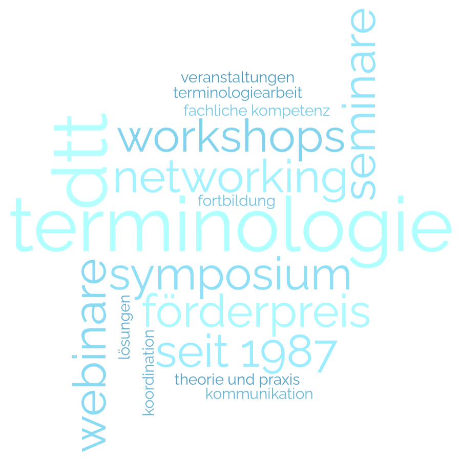 Der DTT e.V. ist ein Forum für alle, die sich mit Terminologie und Terminologiearbeit beschäftigen. Er hat sich zum Ziel gesetzt, durch Beratung und Koordination sowie durch die Veranstaltung von Symposien, Seminaren, Webinaren und Workshops zur Lösung fachlicher Kommunikationsprobleme beizutragen. Alle zwei Jahre verleiht der DTT e.V. den DTT-Förderpreis für herausragende Leistungen auf dem Gebiet der Terminologiewissenschaft und Terminologiearbeit.